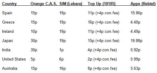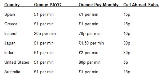 To be fair to Orange, they have made rigorous attempts to make calling abroad more straightforward by making no differentiation between the rates for day/night or peak/off peak times.